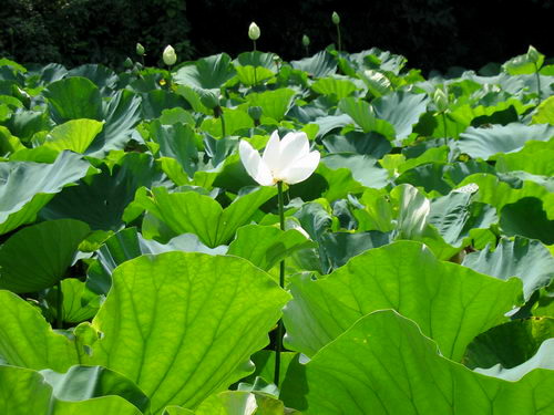 夏真盛りの蓮の花夏も後半になると、もうピンクの花は姿を消して白い花だけになります。