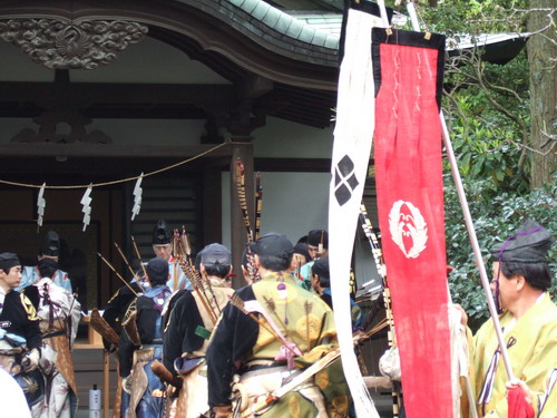 さて、競射も終わり諸役と射手が本殿の方へ向かいます。凱陣(がいじん)の式です。