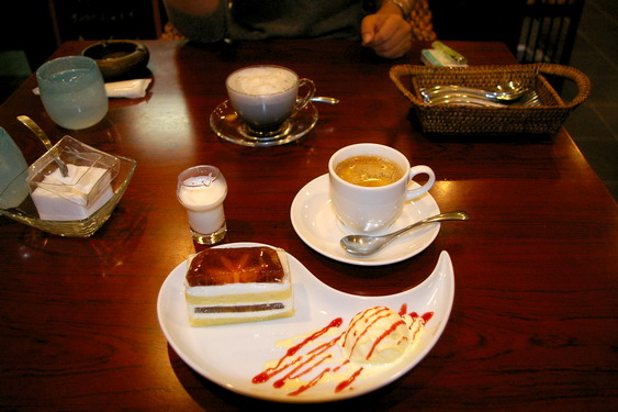 それはともかく、脇に廻って小走りで「こまき」に行ったら・・・、満席。あちゃ〜。 そうしたら連れは「だったらPoocH でケーキでもいい」と。このケーキ、上に載っているのは柿です。生の柿かと思ったら煮てあるみたい。なかなか美味しかったです。奥にあるのは「黒ごまのラテ」。