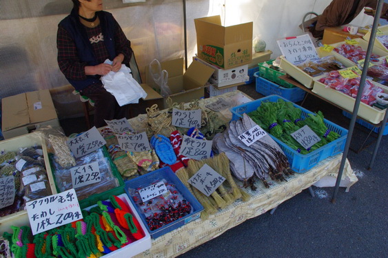 そういえば、どこでもお手玉を売っていました。それとやはり多いのはお漬物ですね。私もつい赤カブの漬物を。ところがその赤カブの漬物、買ってしまってからシマッタ! と思ったんです。 というのは40年前にここ高山でお昼に食べた漬物に感動して、やはり朝市だったかな? 買って帰って家で食べたら・・・、美味くない。でも今回はバッチリでした。こんなことならもうひとつ買っておけば良かった。 しかし朝市は売り物を見ているだけでも楽しいですね。見てください。またたびの実じゃなくて枝(幹?)を売ってますよ。「ネコのおみやです」とカッコ書きが。