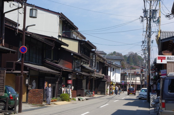 あの交差点の左正面が高山陣屋です。朝市をやってるところですね。もうすぐ春の高山祭りということで、特大の幟が立っていました。春の高山祭は日枝神社の例祭です。