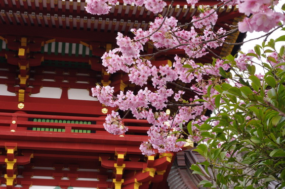 本殿の西側奥です。北鎌倉から歩いてくるとここが入口。いや、入口はこの手前の石段か。 本殿前の河津桜もまだ満開です。