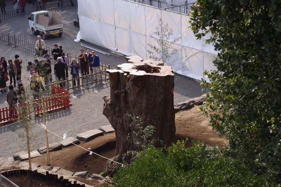 右の石垣の中央が倒れる前の位置です。あちらにはちぎれた根だけを埋めたようです。