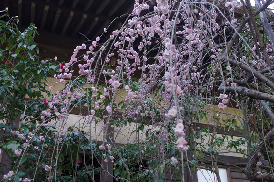 こっちの枝垂梅は満開。でも本堂の影なんで色が・・・。