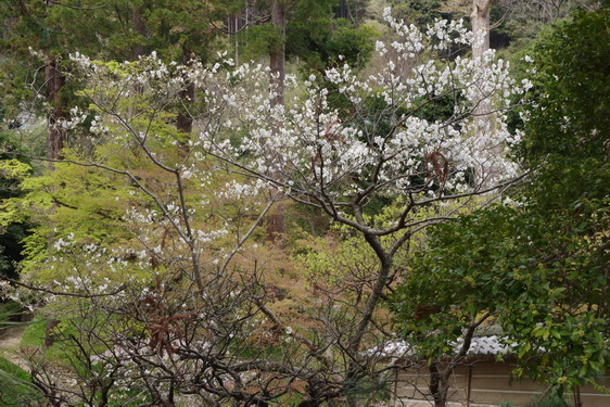 その階段の途中から佛日庵の向うの山の桜を。もうちょっと空が青ければよかったのにねぇ。