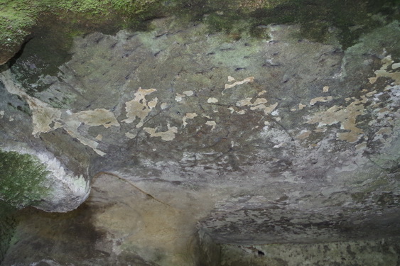 天井には白い漆喰が残っています。今はただの岩穴にしか見えないものがほとんどですが、内部は削りっぱなしではなく、漆喰で平らに白塗りされ、 さらにその上に漆で唐草などの絵が描かれているものもあります。寿福寺の唐草やぐらが有名ですね。ここでは円がうっすら見えますよねぇ。その円の中に彫られていたのは種子(しゅじ)じゃないかと思うのですが。