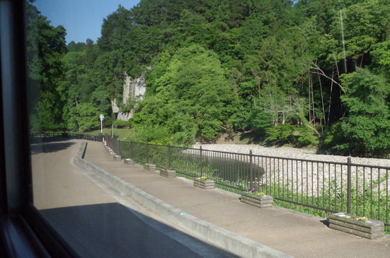 と思って調べてみたら、なんと「弥勒磨崖仏」というんだそうです。つまり種子は脇役。で、前後の画像を見てみたら、こ、これだったのか! 拡大したら腰のあたりの服のたるみは見えましたが、お顔のところは木の陰で。まさか弥勒如来が掘ってあったなんて、走ってるバスのなかからは解りませんでした。ちゃんと「大野寺弥勒磨崖仏」として国史跡になってる。「鎌倉時代前期 承元二年 1208年、安山岩、高さ 13.6m」だそうです。重源が東大寺再建のときに宋から招いた石工達でしょうか。律宗はもう少し後ですね。後に律宗が率いた石工集団の2〜3代前の先祖ですね。 この向こう岸に大野寺ってお寺があったのか、と思ったら、向こう側ではなくこっち側だったみたい。