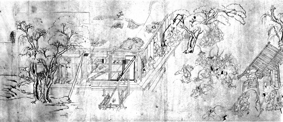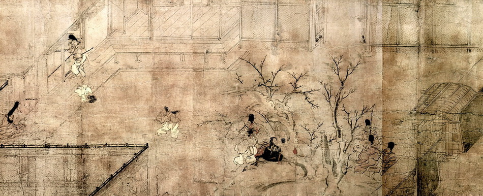 1. 中門廊について。 1:20『年中行事絵巻』 別本巻三・「安楽花」 (ほとんどの場合画像のクリックで次ぎに。変わらなければNEXTで。) 『年中行事絵巻』のこの老朽化した屋敷を見て思うことは3点。 3点とは・・・