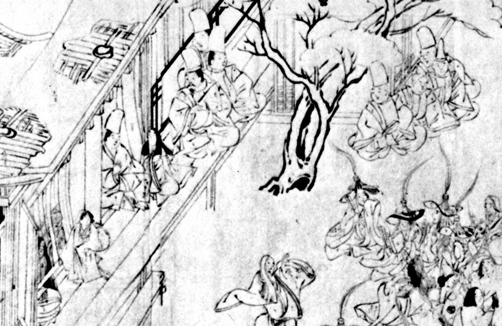 絵師の腕の見せ処は、右から左へ読み進む絵巻の 伝えたい情景の中心はこの部分。 安楽花の踊りにそれを楽しむ貴族一家、門の外から覗く庶民。