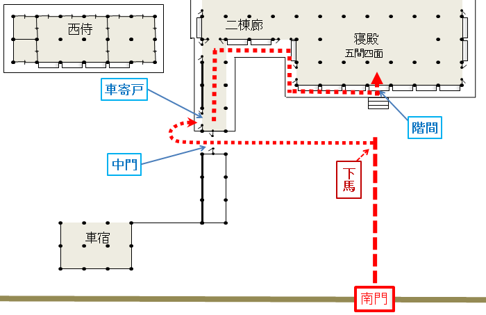 寝殿中央の階間の前まで乗物で行き、階より上がる。 中門廊が出てこないので動線が判らない。 しかし5年後の康元2年2月2日条で「寄御車於寝殿南面。・・・御出自西唐門」と 公式行事で寝殿の南階を出入り口にするのは寝殿正面に門があった頃のなごり? なお建長4年(1252)4月1日条の「入御相州御亭・・御輿入南門寄寝殿」も正式な移徙の作法。 略儀2件の「南門」を寝殿「西南の門」と読めば至極普通の動線になる。 「自南門令入御給 於南庭中央令下御給 経御車寄戸 并 二棟廊 入御寝殿階間」 しかし「南門」を御所の「南面の門」とすると、動線は妙なものに・・・ 「自南門令入御給 於南庭中央令下御給 経御車寄戸 并 二棟廊 入御寝殿階間」は 南庭で馬を下り一旦中門を出てUターンして車寄戸から入ったと? ゴールが目の前というのに、 それとも車寄戸は寝殿側に付いていた? 横連子窓は寝殿向き? そんなバカな! 『建治三年記』12月2日条 11:00御所での北条貞時の元服の記事の動線は |