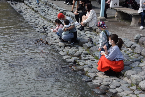 弁天島へ。あのお嬢さんも鯉に餌をやっている処。去年連れてきた三人娘もここで十分以上鯉と戯れてました。