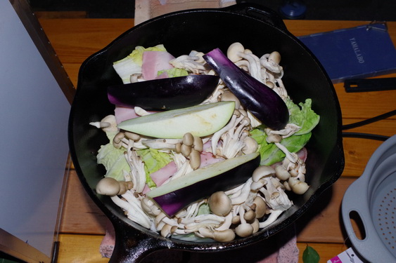 最後のシステムテスト運用テスト直前、最後のシステムテストのテストケースがこれ。これまでの白菜鍋に豚バラ薄切りとしめじを加えてみようかと。ナスは在庫があったのでものは試しです。
