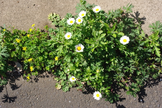 アスファルトの隙間の零れ種なノースポールは、3/15には一輪だったのに、3/27には四輪に。