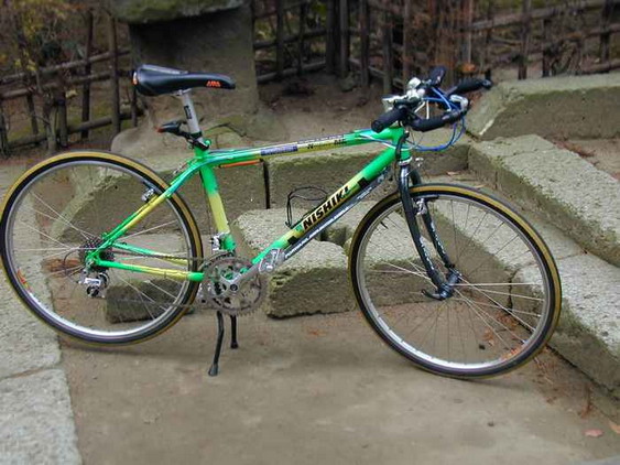 FCYCLO 7番会議室 作成記過去ログ 2000.4.22〜5/11 錦の中古.1今日、ぶらぶらと流していたら、町の自転車屋さんで中古のスタンド付きMTBを見つけました。お値段1万円。覗き込んだらニシキのMTBではありませんか。おっ、これは!! 錦の中古.2さて、「錦の中古」第三話でごじゃります。 てっとり早く出来るところで、タイヤを交換。取り敢えずはビットリア1.6のお古の方に交換してみました。 錦の中古.3 チェーンリング例のXCプロって言うクランクなんですが、これって15mmのソケットレンチで外れるんでしょうか? 14か15かも解らないんですが。シマノとは全然違うみたいで。クランク外さないと内歯がとれないんですわ。(^_^;) 錦の御旗号.4 部品準備完了使用部品の準備が完了しました。5kgの計り(1,900円)も買ってきて、フレームを計測。目盛りは50g単位であとは目盛り間の目分量。多分317gのBB、と確か220gぐらいだったヘッドパーツ、ねじ切りフォークを合わせて3,620gぐらい。フレーム+フォークだけで、粗大ゴミ号より220g(7.7%)重い計算になります。 錦の中古.5 取り敢えず完成取り敢えず組終わりました。5/4丸一日がかり。まあ、途中色々と試行錯誤はあったんですが。2日間軽く走ってみました。昨日5/6は逗子の自転車屋さんの裏山サイです。 |