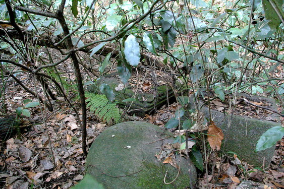 この平場、おそらく多宝寺が有ったころは端に水溝が掘ってあったのでしょうが現在は埋もれてほとんど湿地に近い状態。かつ草木が生い茂って対岸も良く見えません。西側の斜面に藪コキを始めようとしたら、これも倒れた石塔でしょうか。台座の蓮紋と、おそらくその上の石が。